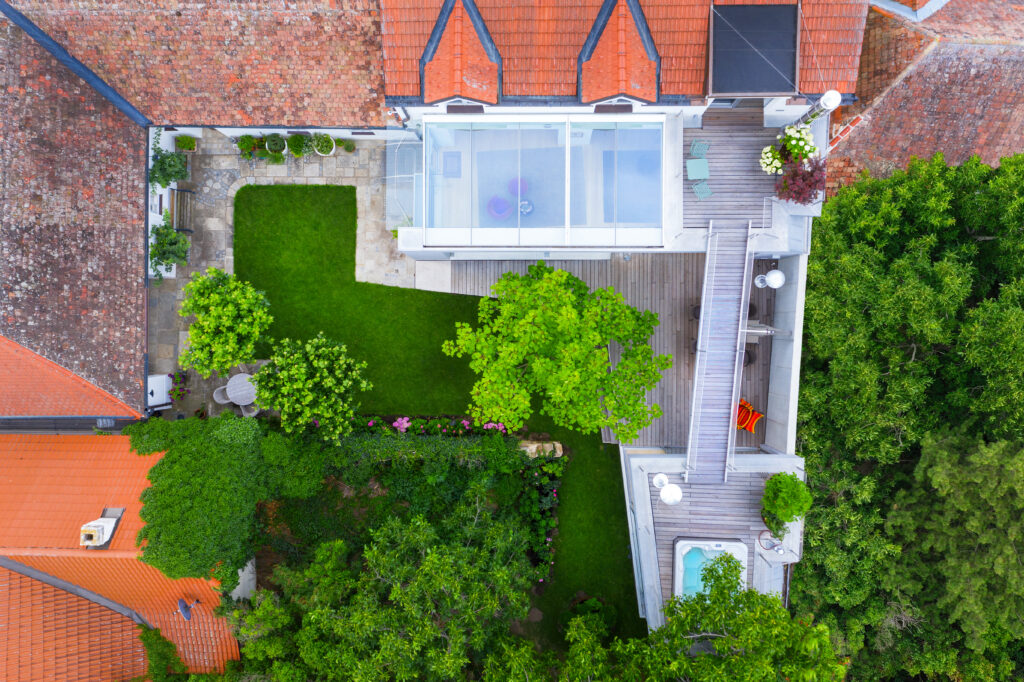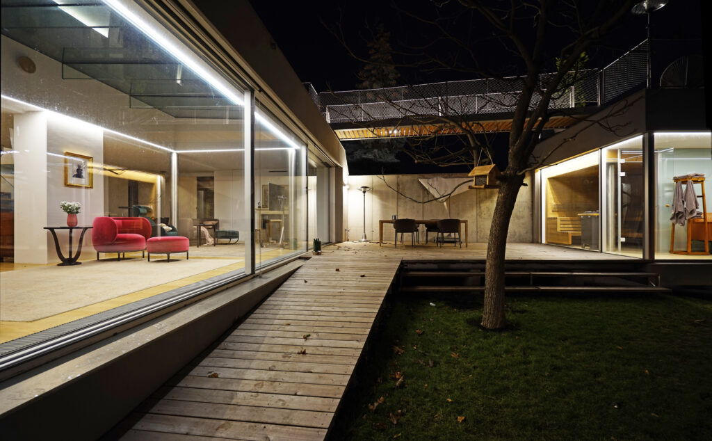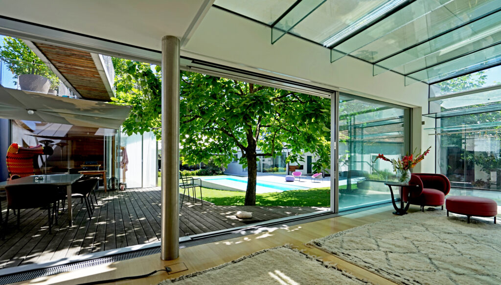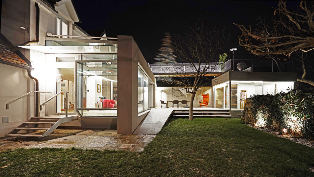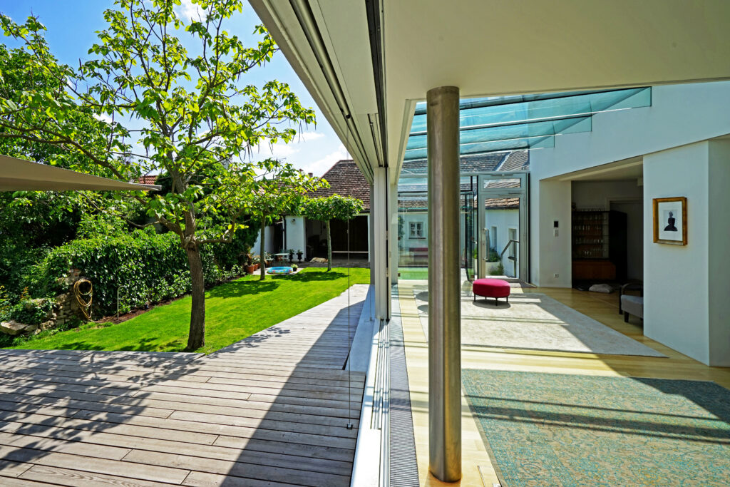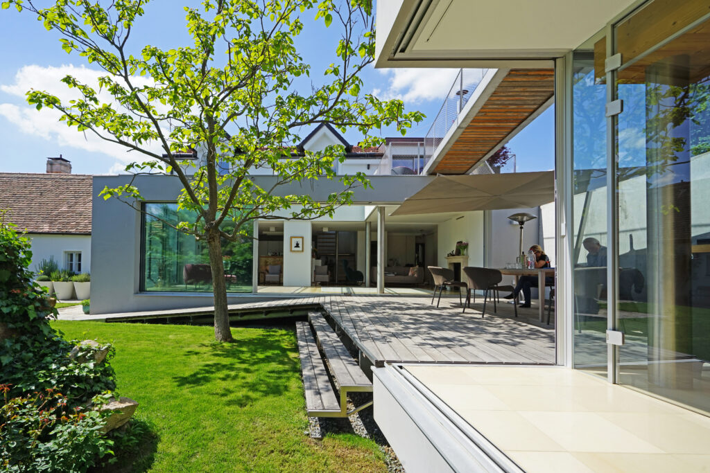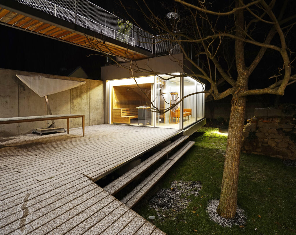 Die Planungsaufgabe bestand darin, das bestehende Haus durch einen Zubau zu erweitern sowie eine Gartensauna und einen Poolbereich anzugliedern. Gelöst wurde sie mit einem Übergang im Freien, viel Glas und einer Reihe kleiner Rückzugsbereiche, die sich wie eine Melodie der Behaglichkeit aneinanderfügen. Diese Verbindungen und die dadurch geschaffenen Refugien stellen den eigentlichen Gewinn dar, denn was von der Straße völlig unscheinbar scheint, eröffnet im Inneren ein inspirierendes Spiel aus Innen- und Außenräumen, geschützten Terrassen und einen oberen Verbindungssteg mit Blick bis zur Retzer Windmühle. Das Spannende daran ist auch, wie eine traditionelle Weinviertler Liegenschaft in ihr Umfeld nahezu hineinwächst.