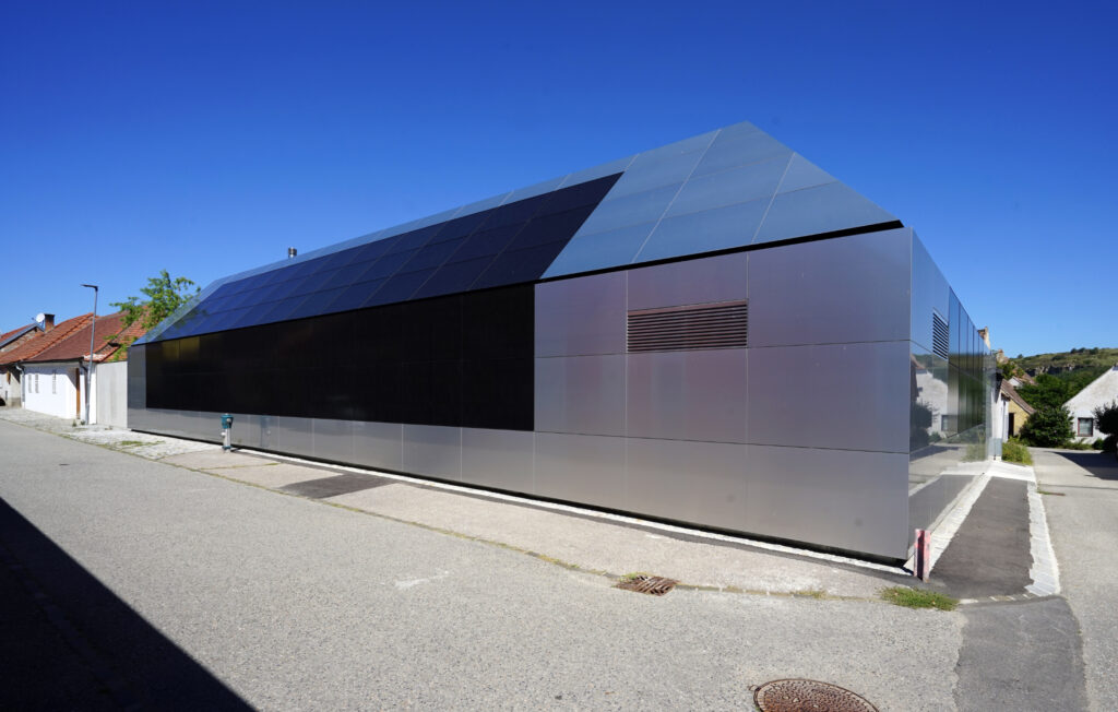 Die Proportionen sowie die Dachform der beiden Vorgängergebäude wurden übernommen und gewährleisten die Integration des Gebäudes in die bestehende, ortstypische Bebauungsstruktur. Die süd- und ostseitige Fassadengestaltung ist als geschlossene Fläche aus recycelten Aluminiumpaneelen ausgebildet und dient primär dem klimatischen Schutz des Gebäudes. Durch die Reduktion von Öffnungen sowie die reflektierenden Oberflächen werden sommerliche Wärmeeinträge minimiert und Überhitzung vermieden. In die Fassadenfläche ist ein Photovoltaiksystem integriert, das den Energiebedarf nachhaltig reduziert.