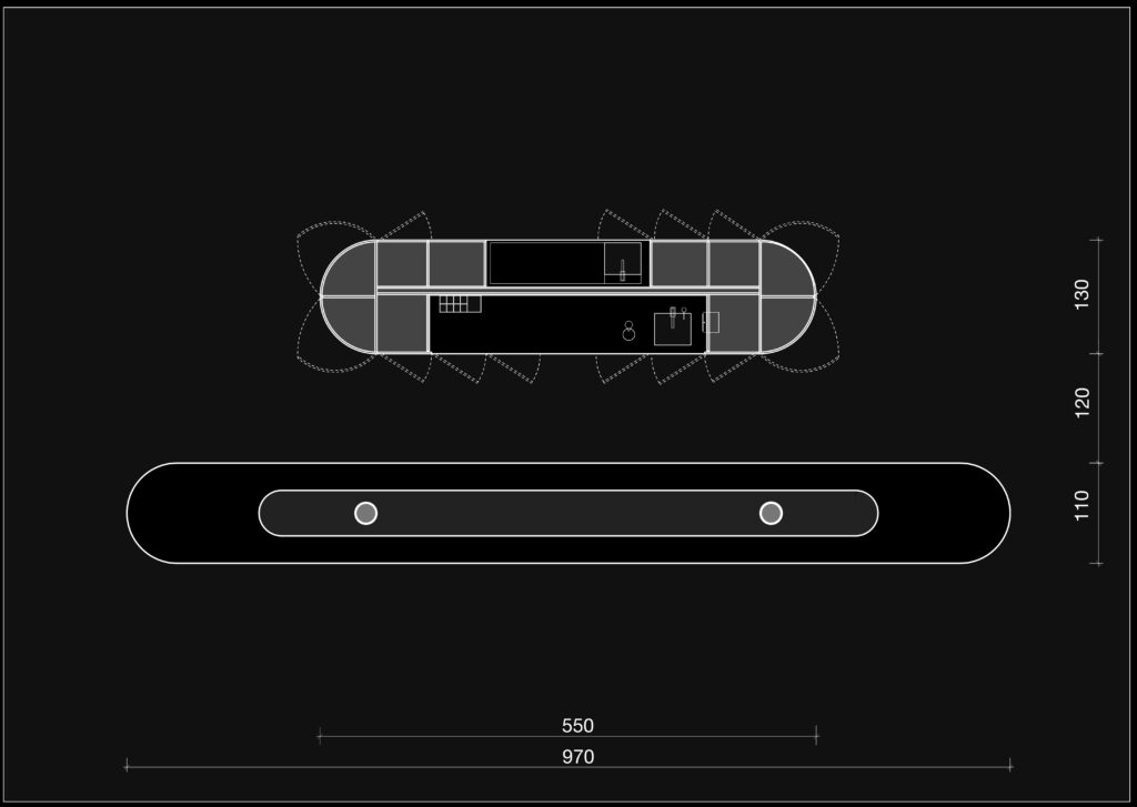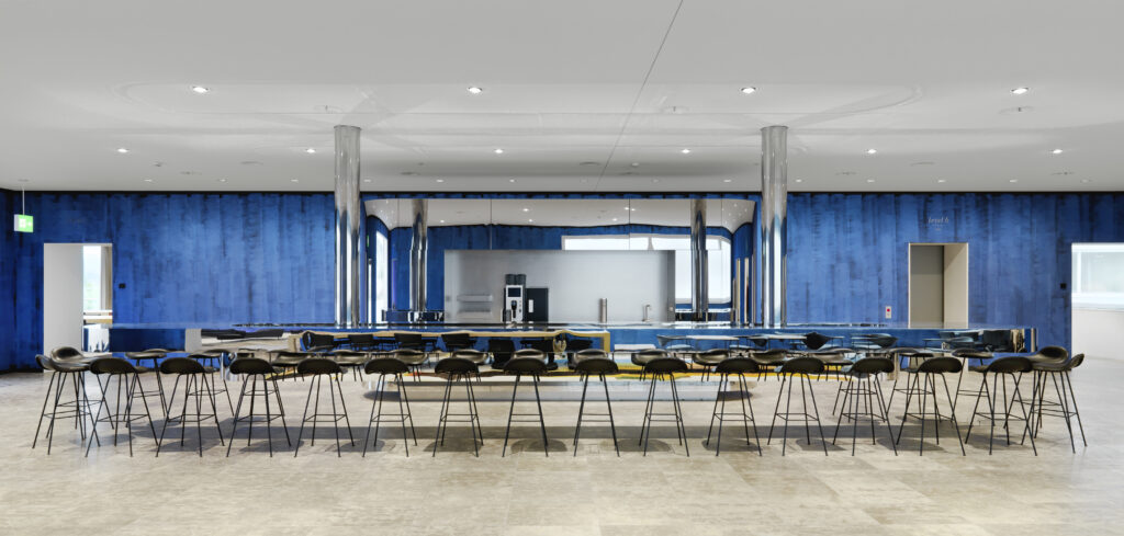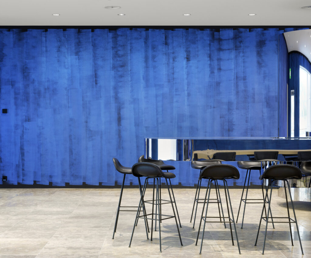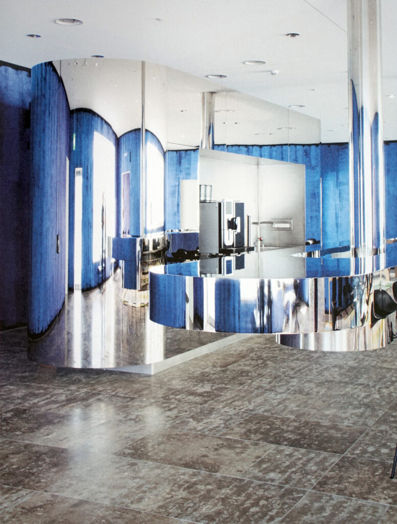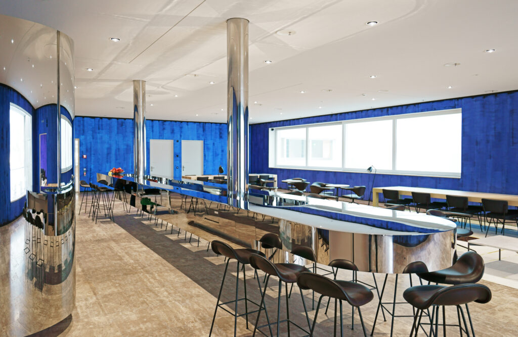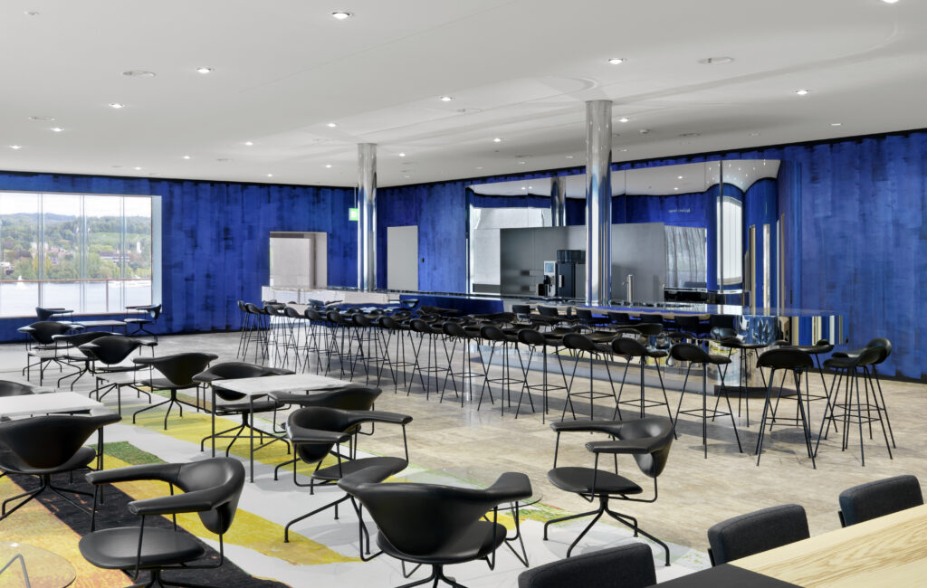Floating just above floor level and seemingly defying the laws of gravity, the visibly heavy bar also has a shimmering and airy quality thanks to it´s polished surface. In formal terms, it responds to a similar kitchen element at the Pavillon Le Corbusier on the opposite bank of Lake Zurich. The walls and the furniture, the art and the architecture answer and reinforce one another – a Gesamtkunstwerk in which the dividing lines between applied and fine art, between sculpture and furniture making are blurred beyond recognition.