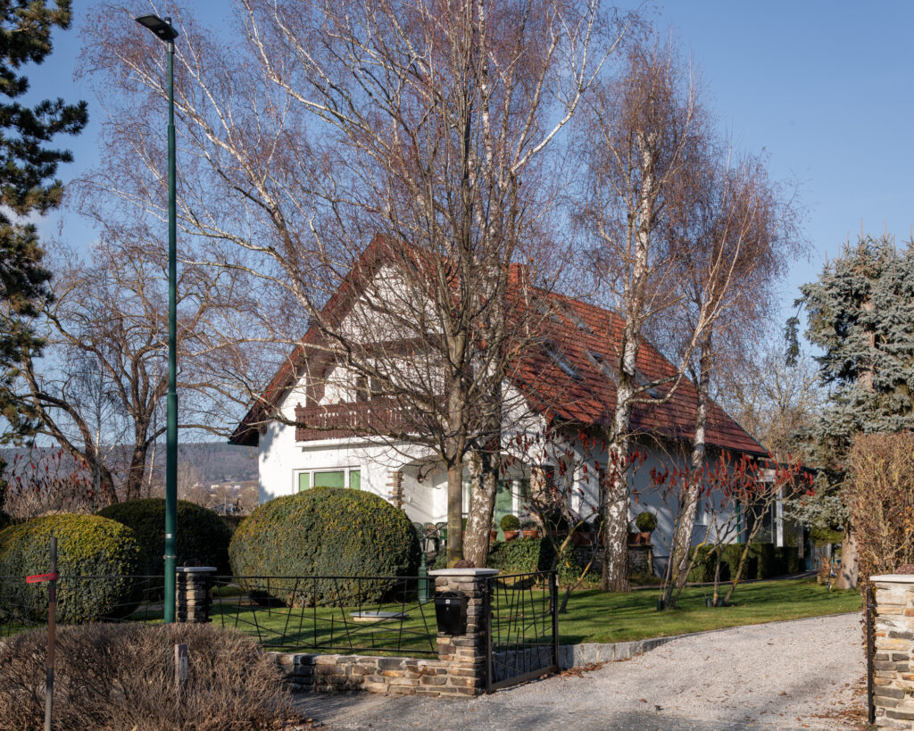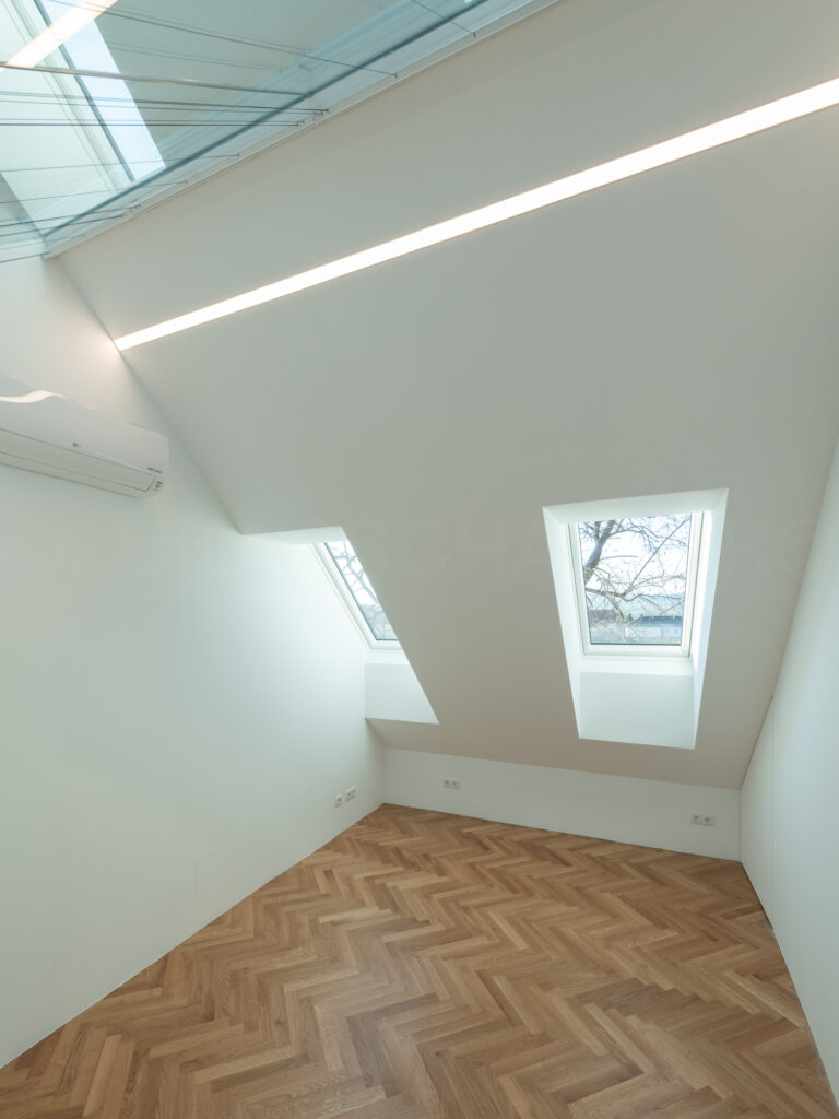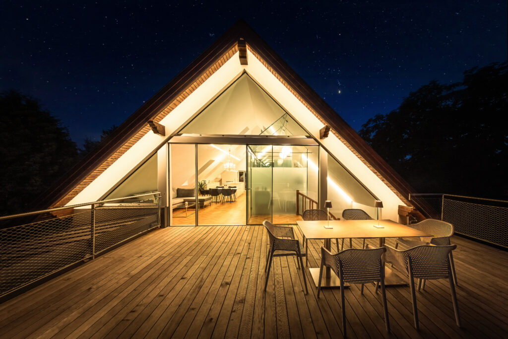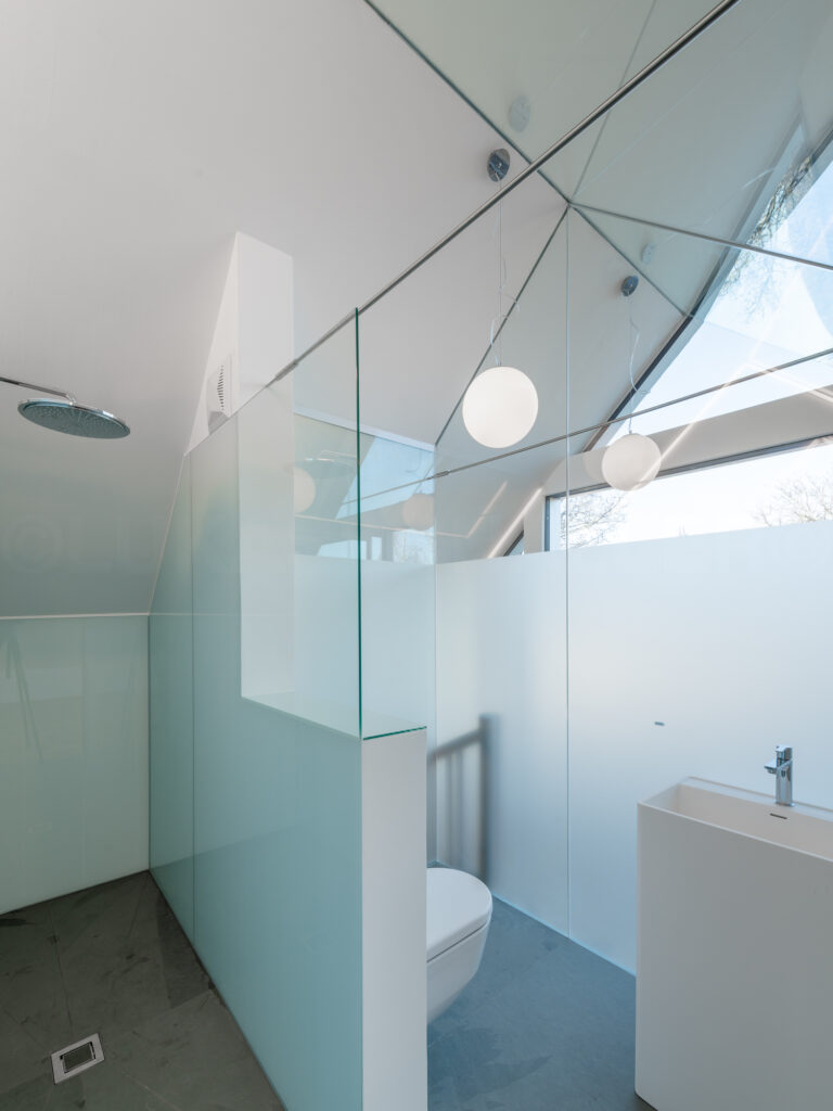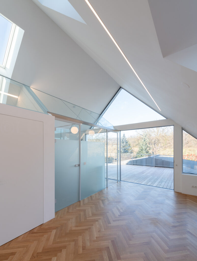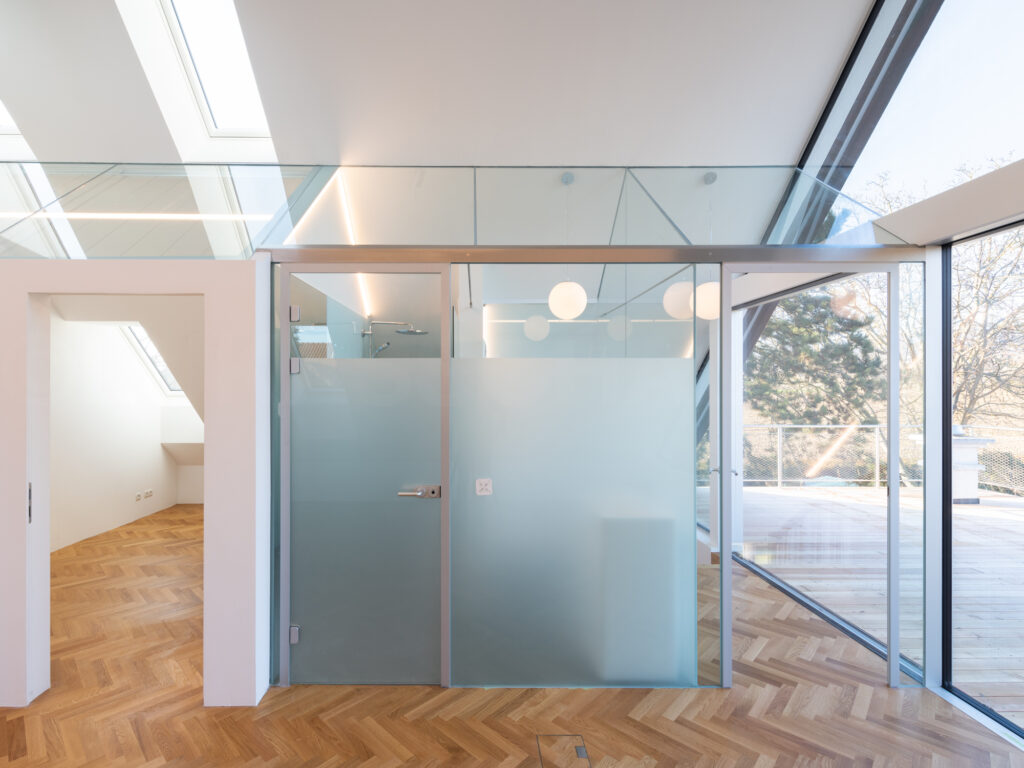 Um die Natur im Dachgeschoß optimal einzufangen , entschied man sich für große rahmenlose Schiebetüren, eine Menge an Glasflächen und eine große, von außen nicht sichtbare, Terrasse. Die besondere Anordnung der 12 Dachflächenfenster und die oberhalb der Schlafräume verlaufende Glasschräge bieten dem gesamten Wohnbereich sowohl Morgen- als auch Abendsonne. Gleichzeitig sind alle Glasflächen mit Jalousien abdunkelbar. Neben der besonderen Lichtsituation ermöglichen die Dachflächenfenster eine natürliche Durchlüftung. Das entsprechende Öffnen und Schließen der Fenster passiert automatisch und richtet sich nach Wettersituation und Temperatur.